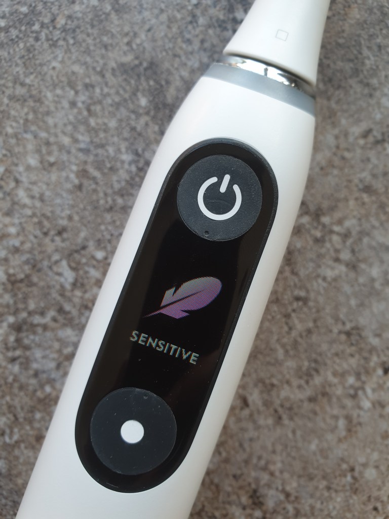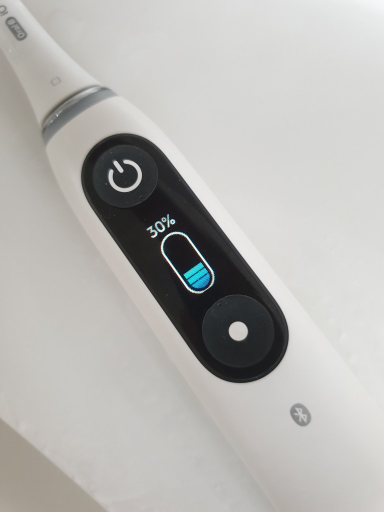 - The interactive display is great! Picking up the brush first thing in the morning, it’ll greet you with a pleasant good morning sign before allowing the consumer to choose their preferred cleaning mode (Note: the iO comes with 7 cleaning modes – Daily Clean, Sensitive, Gum Care, Intense Clean, Whitening, Super Sensitive, Tongue Cleaner) After brushing, the display will either show a smiley/happy face to say you’ve brushed for the recommended two minutes or a sad face, to show you haven’t cleaned for the recommended time. A new feature is the display of the battery life after the smiley face has disappeared. This is shown as a percentage and the battery sign icon has been removed.